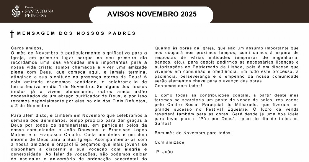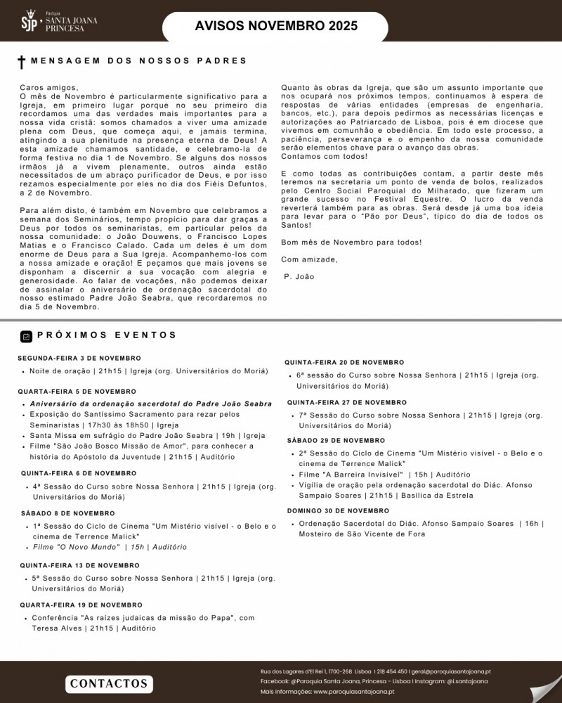 Para além disto, é também em Novembro que celebramos a semana dos Seminários, tempo propício para dar graças a Deus por todos os seminaristas, em particular pelos da nossa comunidade: o João Douwens, o Francisco Lopes Matias e o Francisco Calado. Cada um deles é um dom enorme de Deus para a Sua Igreja. Acompanhemo-los com a nossa amizade e oração! E peçamos que mais jovens se disponham a discernir a sua vocação com alegria e generosidade. Ao falar de vocações, não podemos deixar de assinalar o aniversário de ordenação sacerdotal do nosso estimado Padre João Seabra, que recordaremos no dia 5 de Novembro.