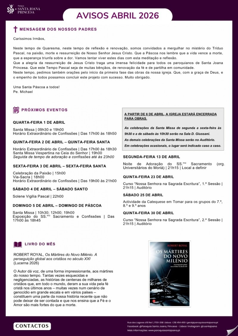 Devido às obras na igreja, algumas celebrações decorrem em locais ajustados — conforme indicado.